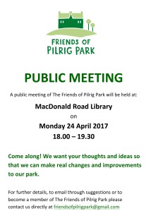 The Friends of Pilrig Park will hold a public meeting on Monday, 24th April at the McDonald Road Library from 6.00-7.30pm. Please see below the draft minutes of the last meeting. The public meetings are a great opportunity to get more involved in making improvements to the park and to put forward your thoughts and ideas. We hope you can make it along!