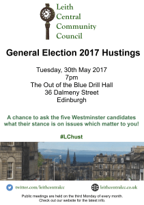 General Election Hustings: Tuesday 30 May Drill your general election candidates! Time: 7pm Date: Tuesday 30 May 2017 Where: Out of the Blue, 36 Dalmeny Street, Edinburgh, EH6 8RG Please feel free to download and distribute this poster: Share this: Click to share on X (Opens in new window) X Click to share on Facebook (Opens in new window) Facebook More Click to email a link to a friend (Opens in new window) Email Click to print (Opens in new window) Print Like Loading... Related