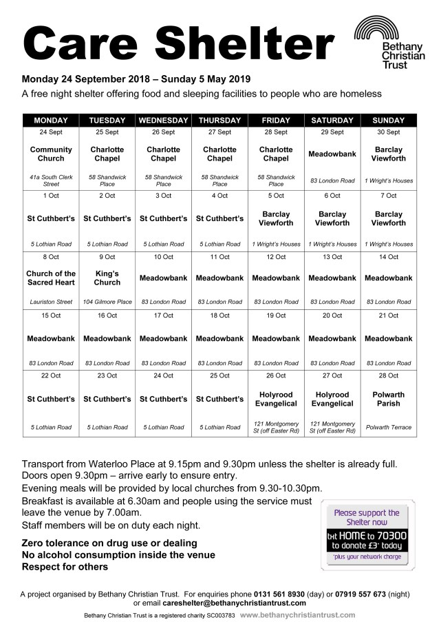 The Care Shelter this winter opens on 24 September 2018 and runs through until 5 May 2019. Please click the graphic to see the rota for 24 September–28 October 2018.