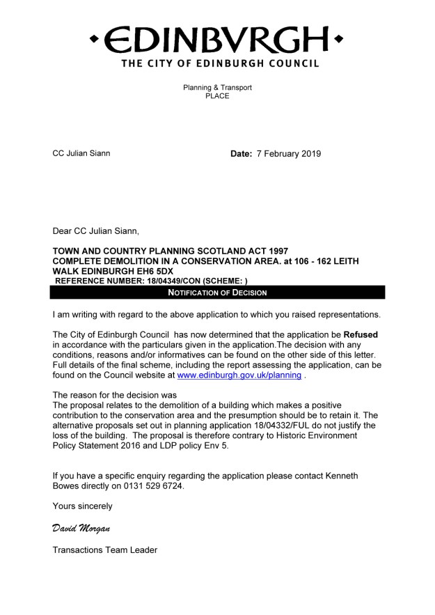 Last week, Edinburgh Council refused planning permission for the ‘Stead’s Place’ development. A letter confirming that decision is below.