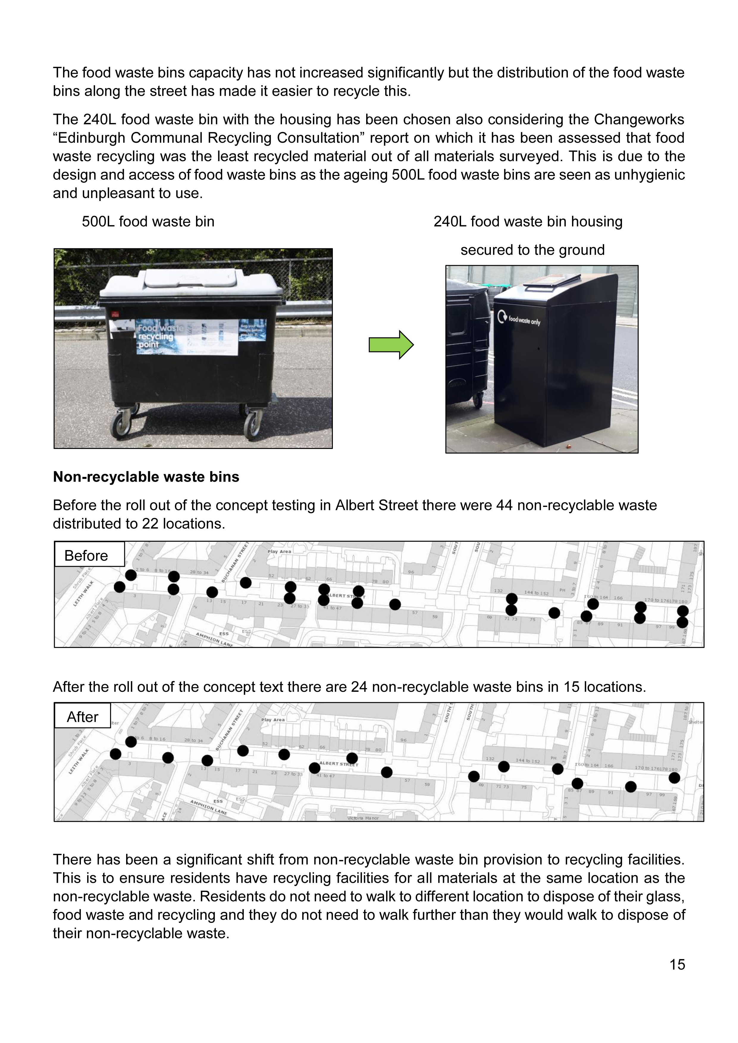 In 2018 Albert Street has been part of the Zero Waste Leith trial area which has been monitored to assess if the increased collection frequency (from twice a week to every other day collection) would prevent overflowing bins. Results from this monitoring programme are presented in the Zero Waste Leith (ZWL) increase frequency trial monitoring report.