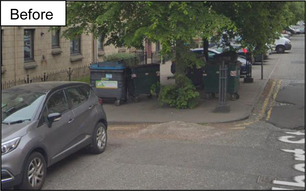 The Zero Waste Leith trial highlighted some operational issues including bins blocked by parked cars. To mitigate those issues measures such as line painting with “keep clear” and bull bars to provide permanent locations for the waste and recycling bins have been implemented. Moreover some street signage have been installed along the street to prevent double parking (see picture below).