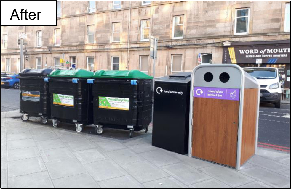 After the roll out there are 14 x 360L glass bin contained in a housing, 1 x 660L bin and the recycling point at the South Sloan Street.