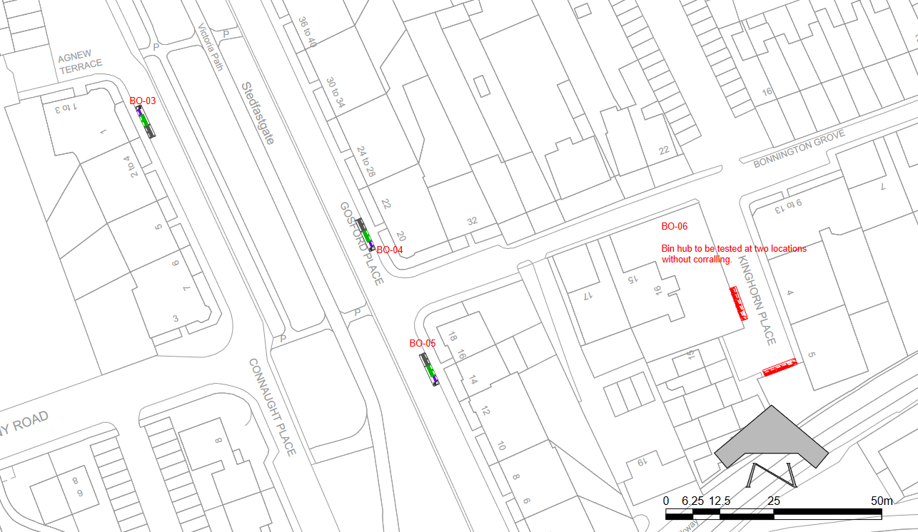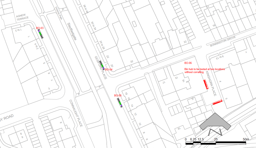 The bin hubs will feature metal railings to keep the bins in place and and include a static ‘food recycling’ bin alongside the green-lidded recycling and black-lidded waste bin. You can see examples of them in Albert Street and across Hillside.