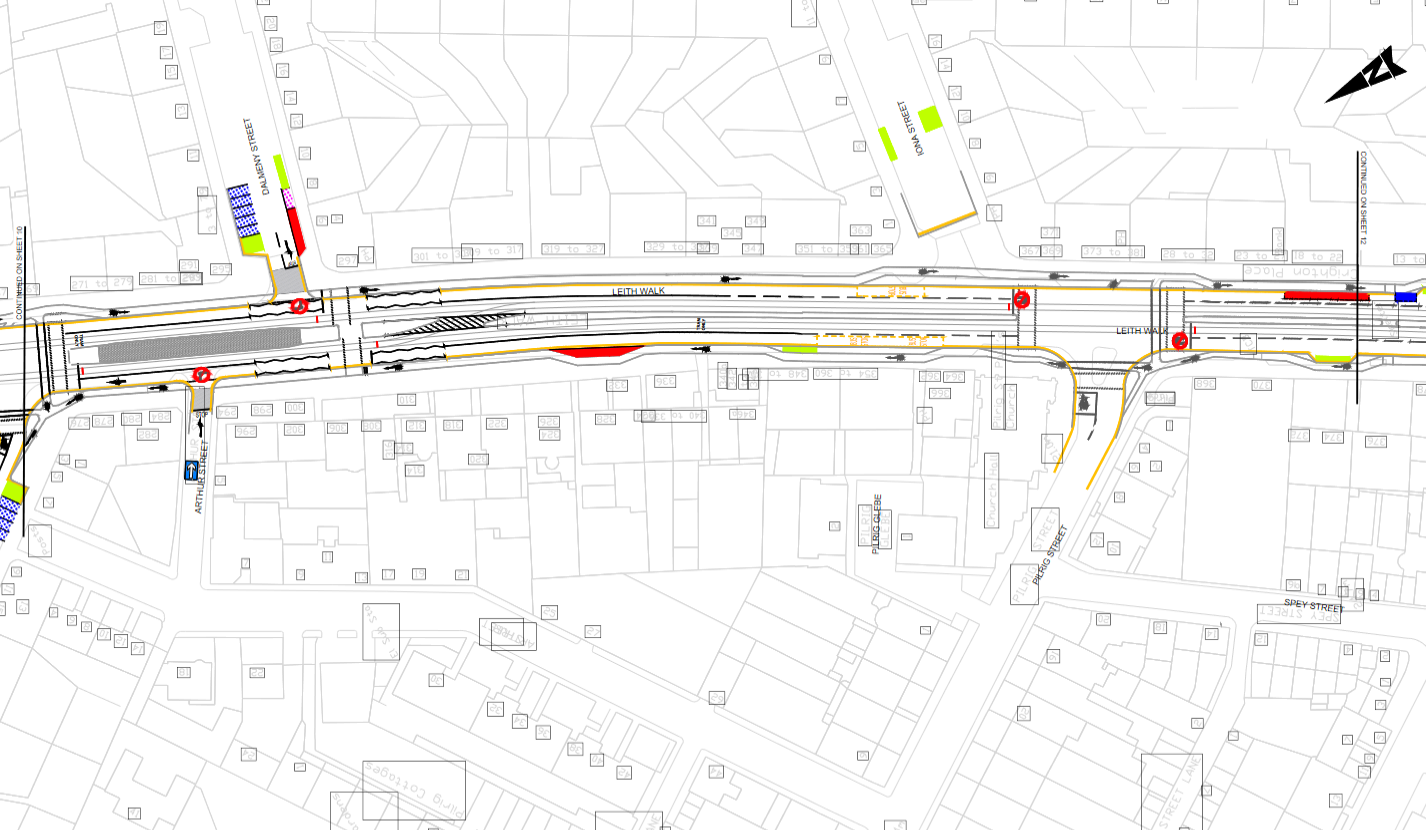 | 3 | Dwg 11 (08-04-21) | We are concerned that the introduction of unidirectional traffic from the Arthur Street “extra dog leg” to Leith Walk (opposite to the status quo ante) will trigger “rat runs” from Pilrig Street traffic heading north on Leith Walk wishing to avoid traffic lights at junction Pilrig Street/Leith Walk, where it will cross a busy pavement near a tram stop with poor sightlines, contrary to neighbourhood traffic policies. | Object. Suggested alternative: the “extra dog leg” (which has no residential frontages) is turned into a cul-de-sac accessed only from the “main leg” of Arthur Street, perhaps with loading bays serving Leith Walk shops and ample pedestrian space, as practiced currently under TTRO measures. |